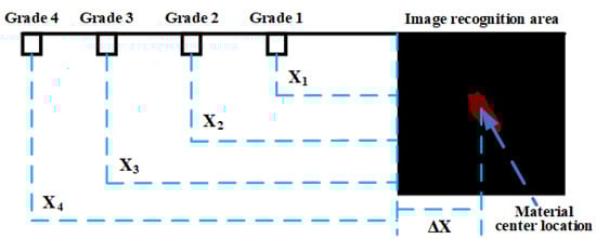 where i is the current material grade (i = 1, 2, 3, 4); is the delay time from the current material out of the image recognition area border to the air jet port (); is the real-time recognition time of the current material; is the real-time distance from the center point of the current material to the left border of the image recognition area, as shown in Figure 12; v represents the speed of the current conveyor belt.
