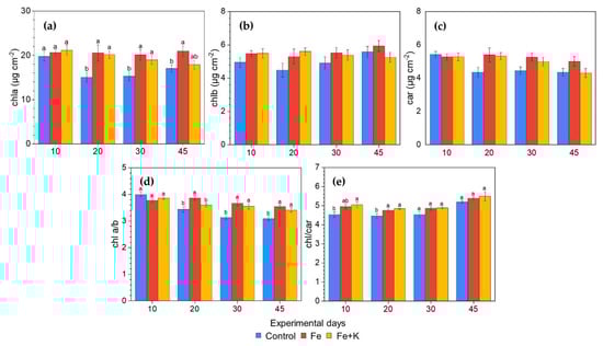 The concentration of all photosynthetic pigments followed a similar profile during the experimental period (Figure 2). High levels were recorded in the first measurement, which were stable throughout the experiment for Fe and Fe+K groups. However, control plants exhibited a decrease from day 20 onward compared to the other two treatments, with statistically significant differences only in chla. The chl a/b ratio was significantly lower in control plants, as was also the case regarding the total chls to car ratio in the first two sampling days, denoting a relatively higher chlb and car content respectively.
