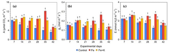 Gas exchange measurements during the experimental period. (a) photosynthetic rate (A); (b) stomatal conductance (gs); (c) transpiration rate (E) (Mean ± SEM, n = 15). Different letters indicate significant differences among treatments at each experimental day (p < 0.05).