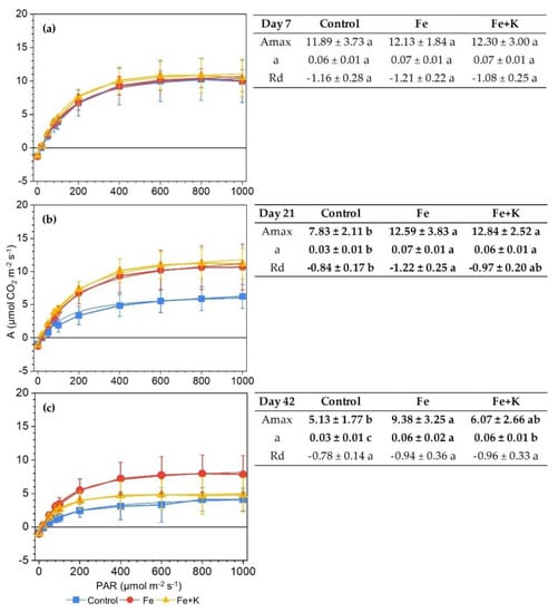 The light response curves of photosynthetic rate were constructed at the beginning, middle and end of the cultivation period (Figure 4). The maximum photosynthetic rates (Amax) and quantum yields of photosynthesis (a) extracted from these curves were similar among treatments only in the first measurement at day 7. The photosynthetic performance of control plants declined progressively, whereas Fe and Fe+K plants showed stable values except for the final measurement. In the latter, Fe+K group exhibited a sharp decrease in photosynthetic response to PAR > 200 μmol m−2 s−1, unlike Fe-treated plants in which only a slight decline of both Amax and a appeared, resulting in significant differences among treatments. Dark respiration (Rd) was high in the young developing leaves of day 7 but then declined in control plants, while sustaining relatively high values in the other two groups.