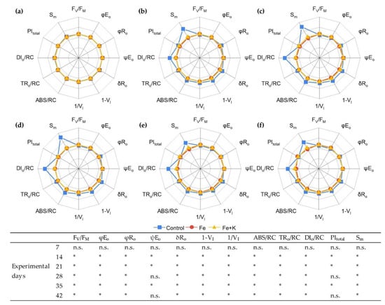 Spider plots of JIP parameters deduced from chl a fluorescence OJIP transient curves in lettuce (mean values, n = 48) for 6 experimental days. (a) Day 7; (b) Day 14; (c) Day 21; (d) Day 28; (e) Day 35; (f) Day 42. Values are normalized to the values of Fe+K treatment. The statistical results for each parameter and day are presented in the bottom table. Since there were no significant differences between Fe and Fe+K groups, all the sings refer to differences of control plants with the other two groups (n.s. means non-significant differences and the asterisk indicates differences at p < 0.001).
