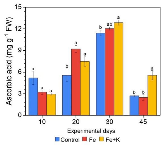 The antioxidant activity of lettuce leaves changed considerably over time (Figure 6) in all plant groups. Leaves of mature plants sampled at day 20 and even more significantly at day 30 showed two-fold increases of their scavenging capacity when compared to day 10. Interestingly, at the end of the experiment, the values of ascorbic acid equivalents dropped to the levels of the first measurement. Concerning the among-treatment differences, the antioxidant capacity of control plants was significantly suppressed compared to Fe+K plants in all sampling days, except of the first measurement at day 10.