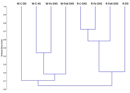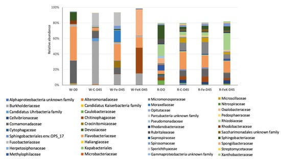 The most dominant bacterial families (cumulative relative abundance ≥80% in the averaged sample). W: water; R: root; C: control; Fe: iron; K: potassium; D0: the first sampling just before the commencement of the experiment; D45: the second sampling at the 45th day of the experiment.