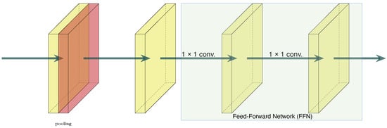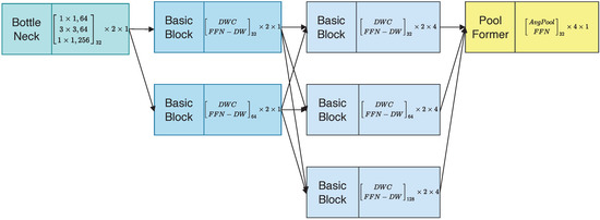 Then, the embedding output is transferred into four repeated PoolFormer blocks. Compared with the block introduced in the previous section, processing is substituted by a simple operator. The structure is shown in Figure 4. The red component is the part. The time complexity is as follows: