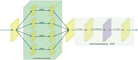 According to the traditional approach, is always set to self- attention [15,20,21,30,45]. The Swin Transformer [21] uses the idea of the sliding window in convolutional neural networks to reduce the time complexity of the self-attention mechanism to a linear proportion of the image size. Based on this idea, HRFormer [29] applies the Swin Transformer to a high-resolution network structure. Figure 2 shows the structure of the HRFormer block where the green part is the local-window self-attention (W-MSA). The feature map is cut into several parts and runs multi-head self-attention in each part independently. Moreover, these parts do not overlap with each other in an image. Each part includes patches; the time complexity of a window based on patches of an image is [21]: