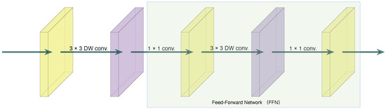 Then, in the FFN part, following the previous operation, the point convolution is used to further integrate the depth information from the depth direction. After that, a set of depthwise and pointwise convolutions is added to extract more information [32]. The blocks behind the second one of Figure 3 show the process of how depthwise convolution and pointwise convolution are used to update features.