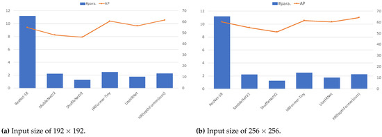 Aiming at the pose estimation task, there are a number of works achieving state-of-the-art performance, such as Hourglass [17], HRNet [9], HRFormer [29], PRTR [15], and UniFormer [30]. These methods have shown a strong ability among large networks in position-sensitive tasks, such as pose estimation and semantic segmentation. It is also worth considering not only accuracy but also computation cost and the number of parameters. In practical applications, models often run on platforms (e.g., hardware) with limited computing resources. In order to deal with this issue, a series of lightweight networks (e.g., MobileNet [31,32], ShuffleNet [33,34], Lite-HRNet [35]) have been proposed.
