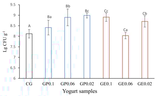 The total number of lactic acid bacteria (LAB) was chosen to assess the survivability of viable cells in the yogurt samples. As shown in Figure 1, the viable cells in the yogurt samples with different levels of GPs was higher than that in CG; particularly, the highest count of lactic acid bacteria (8.99 log CFU/g) was detected in GP0.02. This may be due to the appropriate concentration of GPs that can promote LAB to make better use of the nutrients in yogurt. The results are similar to those of the previous reports [27,28].