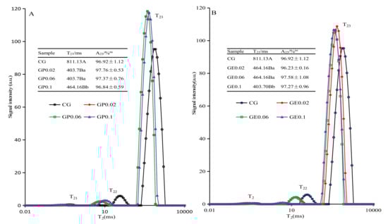 T2 and the corresponding peak areas in low-field 1H NMR relaxometry analyses indicate water molecules’ distribution and movability, including hydrogen protons. Short T2 is attributed to hydrogen atom nuclei in immovable structures, whereas long T2 belongs to hydrogen nuclei in mobilizable structures [33]. As shown in Figure 2, three typical peaks were discerned in whole stages. The first and second peaks (T21, T22) lay at 0.2 to 0.5 ms and 8 to 20 ms, appointed to water protons of tightly bound and semi-bound water, respectively. They have little influence on gel strength and WHC. The third peak with maximal transverse relaxation time (T23) at 400–820 ms was correlated with movable water. The addition of GP or GE had no remarkable impact on T21 and T22; compared to CG, T23 value significantly decreased, which indicated that water in those had a smaller degree of freedom and was more closely bound to non-water components. However, A23 displayed quantity of free hold water by protein gel structure; generally, the A23 of GP and GE was not significantly different compared with CG. Therefore, GP or GE had a better capacity to retain water in matrix space and facilitate hydration of gel structure, which was according to firmness analysis of yogurts (Table 1). Results indicated that the firmness of yogurt was affected by free-water content, which agreed with previous studies [31,32].