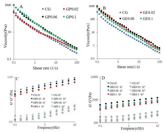 Flow behavior is strongly linked to the intrinsic properties of yogurt, for example, mean particle size, and dynamic stability. As shown in Figure 3A,B, the yogurts showed typical pseudoplastic behavior; the apparent viscosity decreased steadily with increasing shear rate. This may be mainly attributed to breaking bonds between protein polymers [34]. The flow behavior of yogurts containing GP or GE agreed with previous research [23,35]. The apparent viscosities of yogurts with different concentrations of GE were higher than CG (Figure 3B). This is due to the GE interaction with the casein matrix, which connects casein micelle aggregates and chains of milk proteins, creating a firmer three-dimensional deformable system [36]. This agrees with the WHC and texture profile results indicated in Table 1 and Table 2. In contrast, with increasing concentration of GPs, structure of yogurt were homogeneous, and apparent viscosity gradually enhanced as well (Figure 3A). With concentrations of polysaccharides increasing, casein aggregates may be trapped in increasingly viscous polysaccharide solution, making significant increases in apparent viscosity [16]. For the dynamic viscoelastic properties of yogurts, as shown in Figure 3C,D, storage modulus (G′) and loss modulus (G″) for yogurts were frequency-dependent. All yogurts exhibited notable elasticity and stable gel structure, with G′ higher than G″ over the whole frequency range, which indicated that the elasticity of all yogurt samples was always stronger than the viscosity in the test frequency range [37]. In brief, the yogurt samples prepared with GP or GE showed higher viscosity than CG. Moreover, influence of frequency on tangent delta should be analyzed, which would help in more in-depth analysis of rheological properties of yogurt.