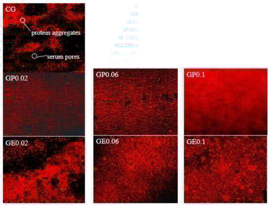 The microstructure of yogurt comprises a three-dimensional aggregate network of casein micelles, interspaced by the zones where whey is trapped or fixed. Microstructure of yogurt was observed using CLSM and the micrographs are shown in Figure 4, denser protein aggregates appeared in red color, and the black areas represented serum pores. After adding GPs, small voids among protein clusters reduced, and protein clusters presented a network structure, which became tighter with increasing concentration in yogurt samples, while CG showed fewer protein clusters with highly visible gaps. These indicated a more uniform structure in yogurt with GPs than in CG, which correlated with the consistency result of TPA. The similar results were observed when anionic polysaccharide was added to the yogurt samples [38,39]. These phenomena were due to polysaccharides, and oppositely charged casein micelles may form complexes with each other via electrostatic interaction. This complexation can enhance gel strength, depending on the structure and concentration of polysaccharides [23]. GE had a lower interaction with casein micelles, and no significant impact on protein network at different concentrations (Figure 4), and compared with yogurt made using GP, those made using GE had looser connections and lesser protein clusters.