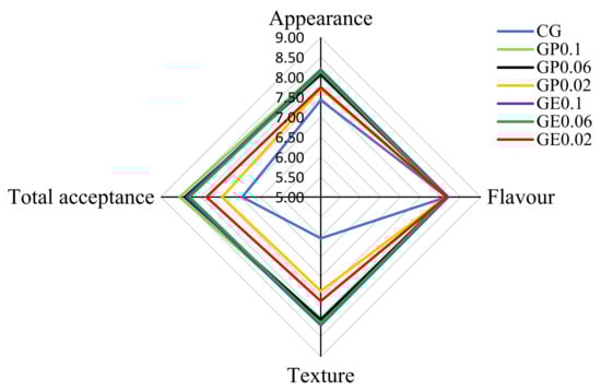 The sensory properties of yogurts obtained after 48 h of storage at 4 °C are presented as a spider diagram Figure 5. Appearance is an important attribute of the quality and product acceptance, and the first impression of food is generally visual. The appearance scores of GP0.1 were higher than those of the others. The yogurt samples with GE or GP added showed similar flavor scores to CG regardless of concentration. Moreover, the texture of yogurts with GP or GE added was largely dependent on concentrations, and those samples showed the higher texture scores than CG, which were in accordance with texture analysis (Table 2). The yogurt sample of GP0.1 showed the highest total acceptance scores (8.53). This result indicated that the inclusion of appropriate GPs was sufficient to positively influence the sensory properties of yogurt. Certain plant-based food ingredients have been known for sensory quality improvements in dairy products. This could be mainly due to improvements in texture/mouth feel and flavors in the final products fortified with plant-based ingredients [40,41].