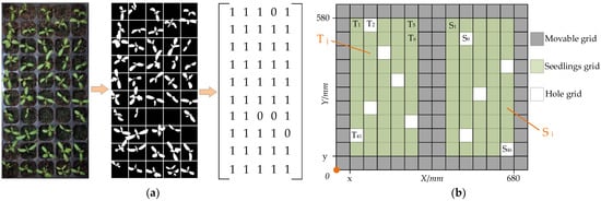 As shown in Figure 2a, the location of the seedless holes in visual image processing is transmitted to PC in the form of a digital matrix that is converted to a grid map of coordinates when a path planning model is established. Set the S tray numeric matrix to S and the T tray numeric matrix to T, scanning the matrix from left to right, top to bottom, corresponding to the coordinate grid, as shown in Figure 2b. The position of the holes in the S tray can be expressed in , and the position of holes in the T tray can be expressed in Tj, corresponding position of the holes of missing and bad seedlings.
