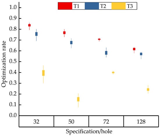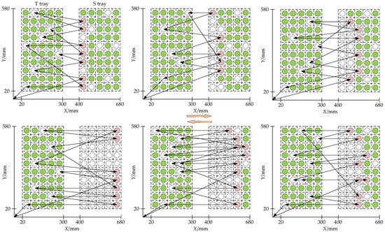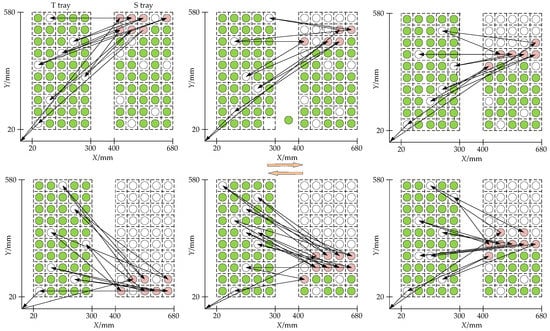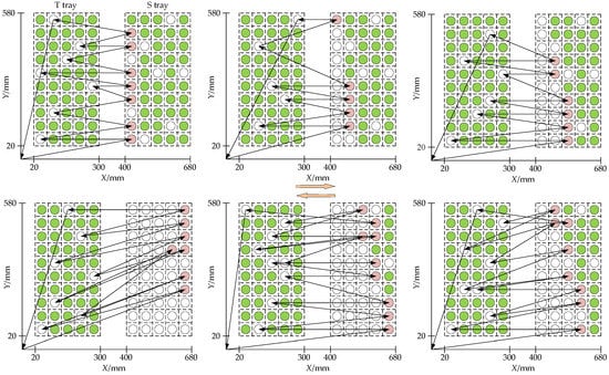 Choose from 32, 50, 72, and 128 holes for simulation, with the T tray and S tray the same size. The number and location of no seedling plug were randomized, the task of replanting one destination tray was defined as one section, and the number of healthy seedlings in an S tray was defined as one group. Poor quality seedlings accounted for 5–20% of the plug trays and required an S tray seedling to give 5–10 T trays seedlings. The length of each transplanting path and the time of the algorithm at each node are calculated and summarized as the experimental results of each group. As shown in Table 1, the number of missing seedlings in each group of plug trays for each of the four sizes; for example, in the first set of tests with 32-hole plug trays, the number of healthy seedlings in the S trays was 25, and replanting was carried out to 5 T trays; in the second set of experiments with 32-hole plug trays, the number of healthy seedlings in the S trays was 26, and replanting was carried out to 6 T trays.