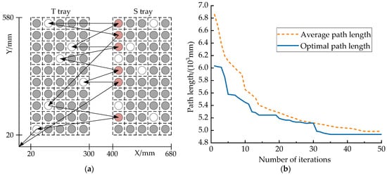 Diagram of (a) path planning of ACA and (b) variation of ACA path planning length with the number of iterations. The red circles indicate healthy seedlings to be transplanted; the grey circles indicate healthy seedlings; the white circles indicate empty holes.