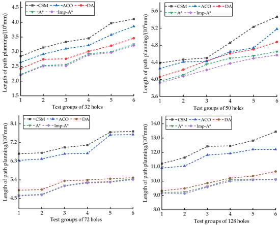 Figure 10 shows the results of the 32-, 50-, 72-, and 128-hole path planning length simulations. DA, A*, and Imp-A* have a similar length of complementary path planning, significantly shorter than CSM, and ACA is superior to the CSM in the length of pathway planning but not as long as DA, A*, and Imp-A*. Based on the results, the statistical transplanting path planning lengths for CMS, DA, ACA, A*, and Imp-A* in the 32-hole plug trays simulation test were 208,690.0, 176,120.0, 193,250.0, 16,560.0, and 163,10.0 mm, respectively; 50-hole path planning lengths were 289,238.0, 269,252.0, 276,670.0, 261,354.0, and 25,666.0 mm, respectively; 72-hole path planning lengths were 428,337.0, 315,354.9, 412,227.0, 305,276.4, and 303,399.0 mm, respectively; 128-hole path planning lengths were 740,250.0, 599,274.5, 701,215.0, 584,310.0, and 580,490.0 mm, respectively. By comparison, we can see the superiority of the five path planning algorithm models in the following order: Imp-A*, A*, DA, ACA, and CSM. Imp-A*, A*, and DA perform significantly better than other algorithm models in terms of path planning length when plugs were increased to 72 and 128 holes. When the number of holes increases, the invalid search of the ACA increases sharply and is more likely to fall into the local optimum, the Imp-A* has a precise heuristic function of bidirectional guidance, and it can find the optimal path more precisely.