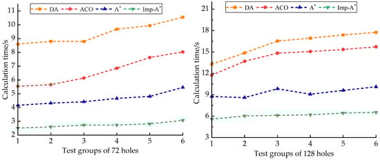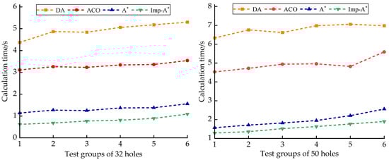 Figure 12 shows a comparison of the computation times for different algorithmic models for path planning. It can be seen that the path planning time of A* and Imp-A* is significantly shortened compared with DA and ACA, and the path planning time of Imp-A* is substantially shortened compared with ACA and A* after the improvement of the heuristic function of A* by using ACA. Based on the results of the experiment, the statistical results show that DA, ACA, A*, and Imp-A* took 29.62 s, 19.84 s, 7.97 s, and 4.86 s for 32 holes; 40.73 s, 29.17 s, 11.12 s, and 9.47 s for 50 holes; 56.36 s, 39.84 s, 27.43 s, and 16.46 s for 72 holes; 96.74 s, 86.40 s, 48.64 s, and 36.88 s for 128 holes transplanting path, respectively. Comparing four algorithm models, the order of time required for path planning is Imp-A*, A*, ACA, and DA. Because when the number of holes increases, ACA and DA search for invalid nodes more frequently and are more likely to fall into local optimality, whereas Imp-A* has a heuristic function of fast bidirectional guidance to find the optimal path in a shorter time.