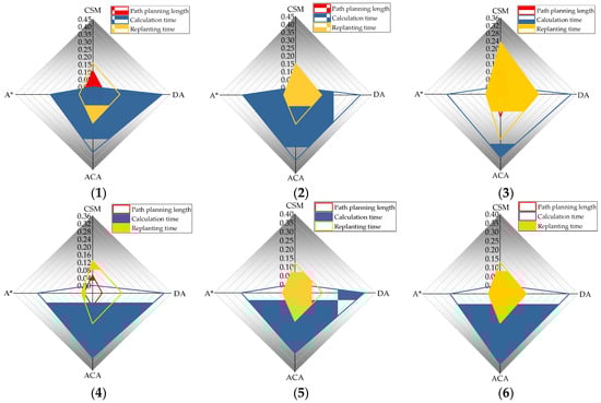 As can be seen from Table 2, CSM, DA, ACA, A*, and Imp-A* have significantly improved performance in practice. The total path planning length of these five algorithm models was 38,986.0, 36,438.0, 37,586.0, 36,170.0, and 35,996.0 mm, respectively, and optimization capability affected: Imp-A* > A* > DA > ACA > CSM. Imp-A*, A*, and DA have similar path planning lengths, 7.67%, 7.22%, and 6.54% shorter than CSM, and 4.23%, 3.78%, and 3.01% shorter than ACA, respectively. The calculation times of DA, ACA, A*, and Imp-A* were 4.53, 4.33, 3.92, and 2.95 s, respectively, and Imp-A* was 34.88%, 31.87%%, and 24.74% less than DA, ACA, and A*, respectively. The total replanting time was 426.93, 414.20, 419.93, 374.85, and 366.02 s using CSM, DA, ACA, A*, and Imp-A* for a total of 39 × 6 holes in the 6 T trays, in descending order: Imp-A*, A*, DA, ACA, and CSM. While the ACA’s calculation time is shorter than DA’s, its path planning is longer than DA’s, leading to longer manipulator execution during the transplant process. Imp-A* saved 60.91 s on CSM, 48.18 s on DA, 53.91 s on ACA, and 8.83 s on A*. The average value of the length of the transplanting path and the time taken by the manipulator to complete each seedling in a plug tray. It is easy to see that Imp-A* performs best in terms of path planning length, computation time, and replantating time.
