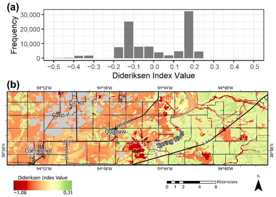 (a) Frequency distribution of Dideriksen crop suitability index values for soils within Quapaw Tribal lands and (b) the spatial distribution of Dideriksen index values.