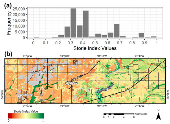 (a) Frequency distribution of Storie crop suitability index values for soils within the Quapaw Tribal lands and (b) the spatial distribution of Storie index values.