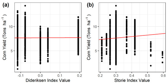 (a) Scatterplot of observed corn yield and Dideriksen index values; (b) Scatterplot of observed corn yield and Storie index values. Red lines represent the best fit line from a linear model of index values and observed yield.