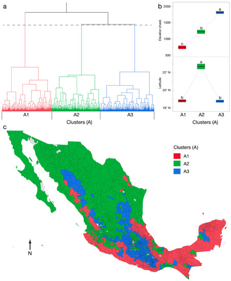 (a) Dendrogram of cluster (A) solution (CCC = 18.81). (b) Differences in mean elevation and latitude shown with 95% means confidence intervals with different letters representing statistical significance as determined by Kruskal–Wallace and Dunn’s post hoc tests. (c) Mapped clusters, with omitted municipalities shaded gray.
