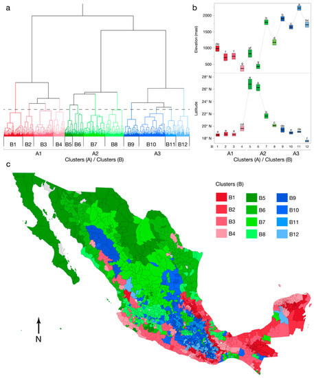 (a) Dendrogram of 12-cluster (B) solution (CCC = 9.06). (b) Differences in elevation and latitude with different letters (a–g) indicating statistical significance as determined by Kruskal–Wallace and Dunn’s post hoc tests. (c) Mapped clusters with omitted municipalities shaded gray.