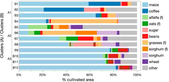 In sharp contrast, the highland farm type (A3) exhibited a cropping pattern skewed towards maize and beans. Further, the A3 type had the smallest share of farmland dedicated to growing less dominant (i.e., “other) crops (Table 2). Interestingly, once stratified in B9-B12 clusters this basic cropping pattern largely remained, exhibiting a more homogenous pattern among the B9–B12 set of municipalities. The pattern strongly reflected the maize-based milpa systems of the central Mexican highlands. While crop genetic diversity (especially maize) can be exceedingly high in milpa systems [69,70]; the crop species compositions in municipalities of these farm regions tend to be more homogenous than among the A2 (B5–B8) regions [47].