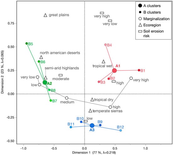 In Figure 5, the MCA correspondence plot illustrates associations among: (1) farm type clusters A, (2) marginality, and (3) water erosion risk; and the supplementary variables: (4) farm type clusters B and (5) ecoregion. In part, due to the simplified, three-level typology A, two dimensions alone explained 100% of the total inertia (λ = 0.28) found in the multivariate relationships. The good separation between the A-cluster groups identified in the HAC analysis (i.e., CCC = 18.81) was reflected in the MCA by the strong spatial separation among A cluster, where each occupied a different quadrant.