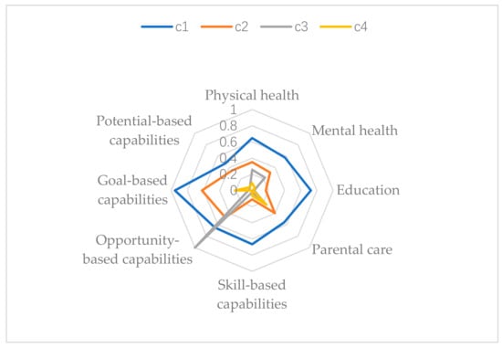 For the latent classes of adolescent capability poverty based on the conditional probability of each dimension, Figure 1 and Table 4 show the conditional probability of each dimension. The first class is Extreme Capability Poverty Class, which had a higher deprivation probability in other dimensions except the potential capability dimension. Although not deprived in the dimension of potential capability, the probability of being deprived was higher than in other classes. The LCA model estimated that 5% of adolescents fell into this class.