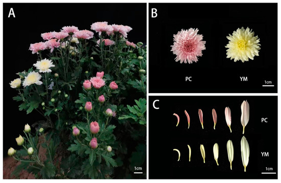 Phenotypic differences between ‘Pink Candy’ (PC) and yellow-colored mutant (YM) chrysanthemum flowers. (A) The phenotypes of PC and YM under standard cultivation conditions. (B) Top view of inflorescences of PC and YM at the full-bloom stage. (C) The phenotypes of different layers of ray florets of PC and YM. Bar = 1 cm.