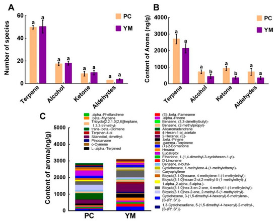 The analysis of aroma compounds in the ray florets of PC and YM at the full-bloom stage. (A) The number of species of four types of aroma compounds in ray florets of PC and YM. (B) The content of species of four types of aroma compounds in ray florets of PC and YM. (C) The content of the specific aroma components in ray florets of PC and YM.