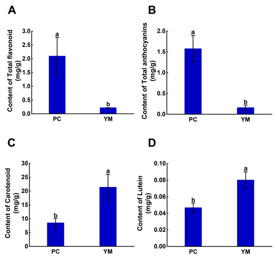 The content of pigments in the ray florets of PC and YM. The content of total flavonoids (A), total anthocyanins (B), carotenoids (C), and lutein (D) in ray florets of PC and YM. Different letters indicate significant differences at p < 0.05 according to Duncan’s multiple range test.