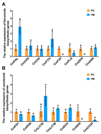 The relative expression levels of genes related to the biosynthesis of flavonoids (A) and carotenoids (B) in the ray florets of PC and YM. Different letters indicate significant differences at p < 0.05 according to Duncan’s multiple range test.