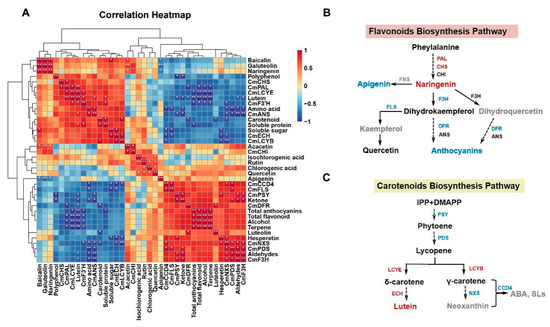 (A) The correlation analysis of detected metabolites and expression levels of related genes in PC and YM. (B,C) The working model of flower color transformation of YM. Red coloration means increased metabolites and gene expression in YM flowers compared to PC flowers, while blue coloration means decreased metabolites and gene expression in YM flowers. Gray coloration indicates the undetected metabolites in this study. Abbreviations: PAL, phenylalanine ammonia lyase; CHS, chalcone synthase; CHI, chalcone isomerase; FNS, flavone synthase; F3H, flavanone 3′-hydroxylase; FLS, flavonol synthase; DFR, dihydroflavonol 4-reductase; ANS, anthocyanidin synthase; PSY, phytoene synthase; PSD phytoene desaturase; LCYE, lycopene ε-cyclase; LCYB, lycopene β-cyclase; ECH, ε-carotenoid hydroxylase; NXS, neoxanthin synthase; CCD4, carotenoid cleavage dioxygenase 4.