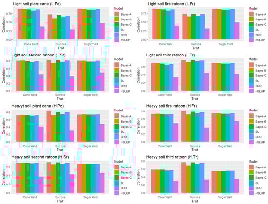 Model predictability was also examined without incorporating any fixed component into the model. For this, total five datasets were retrieved, named, light soil, heavy soil, plant cane, ratoon, and all combined. Each dataset containing 95 genotypes and 3906 SNPs (markers) was partitioned randomly into 10 parts, of which nine parts were used for the training data for every model and the remaining one part for validation. Each random part consisted of nine or ten random genotypes. This process was iterated until all 10 parts were exhausted for the testing set for the traits to perform 10-fold cross-validation. Furthermore, the correlation between the BLUEs and GEBVs of the clones was calculated for every trait by using all datasets.