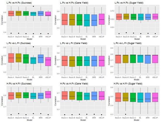 Boxplots showing rank correlations between the actual and predicted phenotype in 10-fold cross-validation. L—Light soil, H—Heavy soil, Pc—Plant cane, R—Ratoon, and Fr—First ratoon.