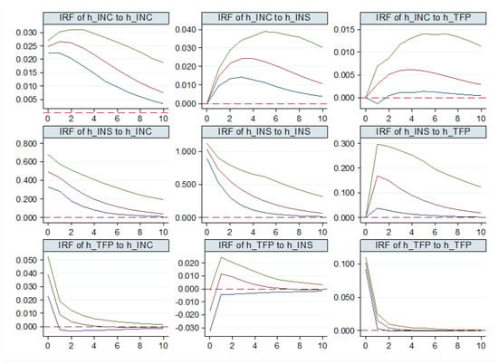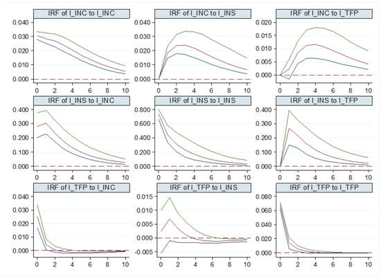 The Wald coefficient constraint test was used to further analyze the short-term dynamic effects between the agricultural technology progress, agricultural insurance, and farmers’ income, and to investigate the Granger causes among the variables. As shown in the test results in Table 5: (i) In the whole and sub-region, the joint significance has passed the 5% significance test, which has verified the rationality of the model construction to a certain extent and explained that the joint effect of each variable has a significant predictive effect on the explained variables. (ii) There is a significant Granger causality effect between farmers’ income and agricultural insurance, which indicates that the interaction mechanism between the two is obvious in the short term. The improvement of farmers’ income level is conducive to the development of agricultural insurance, while agricultural insurance prevents agricultural risks, maintains the safety of agricultural production, and ensures the increase of farmers’ income. This result is consistent with theoretical hypothesis H2. (iii) There is a significant Granger causality effect between farmers’ insurance and agricultural technology progress, which indicates that the short-term mutual dynamic driving effect between farmers’ insurance and agricultural technology progress is obvious. Agricultural insurance ensures the safety of agricultural production, provides a basis for farmers to optimize resource allocation, and thus improves agricultural technology progress. (iv) Farmers’ income is the one-way Granger cause of agricultural technology progress, which indicates that the increase of farmers’ income in the short term has a significant dynamic driving effect on promoting the development of agricultural technology progress. The investment in agricultural technology needs the support of funds. The increase in farmers’ income can enable farmers to learn advanced agricultural technology, purchase agricultural production machinery, etc., thus bringing about the improvement of agricultural technology progress.