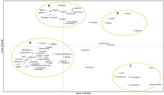 The Principal Coordinate Analysis (PCoA) widely scattered the 58 accessions (Figure 1). Four groups (A–D) could be identified. Group A contains 13 accessions, mostly registered varieties, or former, expired varieties of Hungarian breeding, or from neighboring countries. According to personal information from breeders, some of them have French or Australian origin as one parent side. ‘Medea’ and ‘Minoan’ originate from the same cross and are very close to each other. ‘Botond’ and ‘Slovakian 2′ may also be related through breeding. Australian accessions (2 and 4) originate from different pools, but a common origin cannot be excluded. Indeed, they share exactly the same SSR profile in the selected loci. ‘Tebona’ is an old industrial variety selected from a genotype originated from an international seed exchange without any further known details. In case of the remaining two accessions, it is difficult to explain their position in this group. According to genebank passport information, the origin of ‘Berkut’ is the Ukraine. The accession ‘PSTG Mures’ was received from VÚRV genebank, with the information about Belgian origin. However, its name refers to Romanian origin.