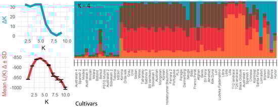 Bayesian STRUCTURE analysis (Figure 2) confirmed the groups identified in the PCoA plot (Figure 1). The Evanno method (ΔK and Mean K) indicated that a K = 4 model best fits the data, meaning that the accessions represent four main genetic clusters. Accessions from group A were the least admixed (mainly blue in Figure 2). Additionally, group C harboring the landraces was less admixed compared to the remaining accessions (mostly orange in Figure 2). Accessions belonging to group B are mostly composed of three genetic clusters (In the middle of the barplot, Figure 2). Accessions of group A and accessions from the middle of the PCoA plot are composed of all four genetic clusters and are hard to distinguish in the barplot. Accessions from group A have a higher proportion from the blue cluster, which is dominant in group C, while the accessions, which are located in the middle of the PCoA plot, share the four genetic clusters in varying ratios. Genetic indices, in the case of these four groups, are shown in Table 5.