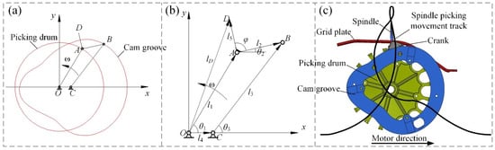 In Figure 1a, points O, C, A, B, and D are the center of the picking drum, the center of the cam groove, the intersection of the crank and the drum, the intersection of the crank and the cam groove, and the end vertex of the spindle at this position, respectively. The OA rod represents the picking drum, the rod length is the drum radius l1, and the included angle with the horizontal direction is θ1; the AB rod represents the crank, the rod length is the crank length l2, and the included angle with the horizontal direction is θ2; the CB rod represents the pole diameter from the center of the cam groove to a point on the contour of the cam groove, the rod length is the pole diameter length l3 at this position, and the included angle with the horizontal direction is θ3; the OC rod represents the frame, and the rod length is l4; the AD rod is the guide rod, which represents the spindle fixed with the crank, the rod length is l5, and the included angle with the crank AB rod is φ. Taking point O as the origin, a plane rectangular coordinate system is established.