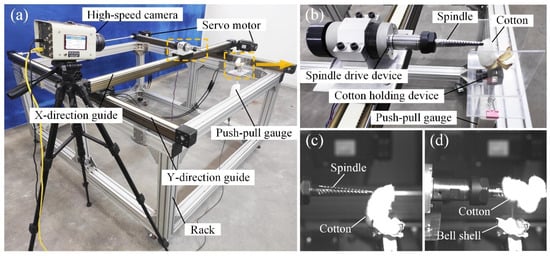 The dynamic picking performance test bench for spindle picking is shown in Figure 3a. It is mainly composed of a frame, a guide rail motion platform, a spindle drive device, a cotton holding device, a high-speed camera, and an electrical control system. The guide rail motion platform consists of one X-direction guide rail, two Y-direction guide rails, and two servo motors. The guide rail adopts a synchronous belt module structure, and the servo motor drives the guide rail slider to perform the reciprocating linear motion. The spindle-picking drive device is installed on the X-direction guide rail, which is composed of a BLDC motor (Rated power, 275 W; rated current, 4.9 A; rated speed, 6000 r/min; rated torque, 0.45 N·m), a fixture, and a spindle, and is used to drive the spindle to rotate at a high speed. The push–pull gauge is fixed at one end of the rack, the cotton-holding device is fixed on the upper end of the push–pull gauge.