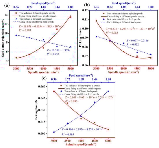 Figure 4c shows that the picking force gradually decreases with the increase of spindle speed. This is because the centrifugal force on the cotton increases when the spindle speed increases, and the corresponding positive pressure between the cotton and the surface of the spindle decreases, resulting in a decrease in the friction between the cotton and the surface of the spindle, and then the picking force on the cotton wrapped around the surface of the spindle is reduced [27]. The picking force gradually increases with the increase of the feed speed. This is because, with the increase of the feed speed, the acceleration obtained when the cotton is in contact with the spindle increases, the radial picking force Tr increases, which in turn leads to an increase in the picking force.