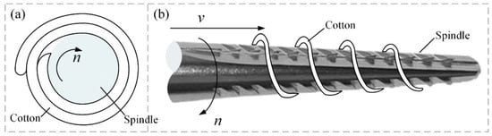 Spindle winding cotton method: (a) overlapping winding and (b) spiral winding.Figure 4b shows that the picking time gradually decreases with the increase of spindle speed. This is because the length of the cotton after elongation is limited under a certain elongation rate of the cotton flap, and the higher the spindle speed, the shorter the winding time. With the increase of the feed speed, the picking time gradually decreased. This is because the variation range is small due to the winding of the cotton being spiral overlapping when the feeding speed of the spindle is low. Additionally, the cotton wound on the surface of the spindle is mainly concentrated at the front end of the spindle because the diameter of the front end of the spindle is small, and the winding time is longer for a certain length of cotton. When the feed speed is high, the winding method of the spindle is spiral winding, the surface of the spindle is evenly wound with cotton, and the winding time is short for a certain cotton length [35].