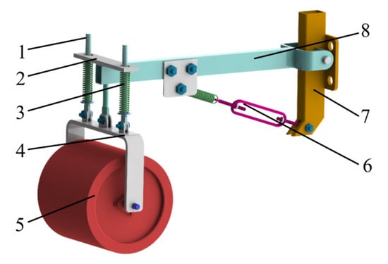 A structural diagram of the BPPD: (1) hanger rod, (2) limiting plate, (3) balance spring, (4) lower bracket, (5) press roller, (6) compression strength regulator, (7) front beam and (8) upper bracket.