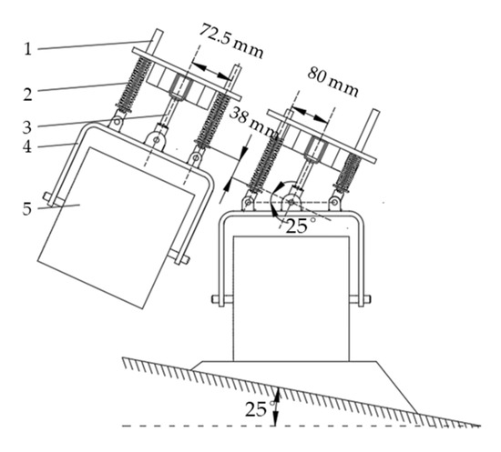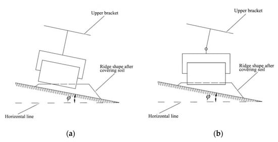 When the seeder works in hilly areas, there is often an angle between the ground and the horizontal line (φ), and the frame is parallel to the inclined plane. The traditional press device is rigidly connected with the upper bracket and cannot rotate horizontally relative to the upper bracket, so there is an angle between the traditional press device and the soil surface after the overlying soil. In this way, the inconsistent penetration depth of the transverse press roller results in uneven transverse compaction, as shown in Figure 2a. The BPPD can rotate around the joint relative frame and can be parallel to the surface of the overlying soil under the action of gravity and a balance spring, so the depth of the press roller is the same and the lateral compaction is uniform, as shown in Figure 2b. When the seeder is not in operation, the press roller can automatically retract so that the impact force on the BPPD can be reduced, and the BPPD can be protected. The function of the compression strength regulator is to change the compaction intensity by changing the spring pre-tightening force and finally to achieve the purpose of enhancing the compaction effect [31]. The main structural parameters of the BPPD are shown in Table 1.
