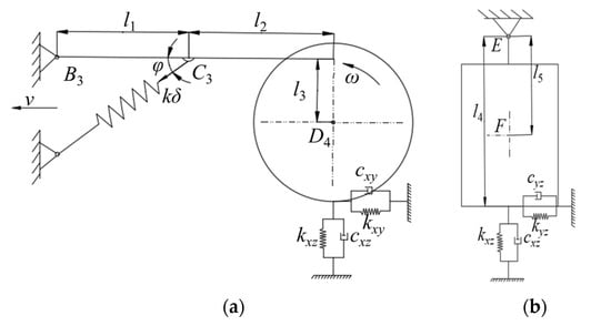 BBPD has 2 degrees of freedom in space: longitudinal rotation and lateral rotation. In order to ensure the rationality of the mathematical model, the following assumptions are made: (1) ignoring the low-frequency vibration of the planter which is caused by the ground; (2) regarding the soil as a viscoelastic body; (3) ignoring the degree of freedom in the forward direction. The mathematical model of the BBPD is shown in Figure 4. D4 is the center point of the press roller in the mathematical model of longitudinal motion, F is the center point of the press roller in the mathematical model of lateral motion, the moment of inertia around point B3 is J1, and the moment of inertia around point E is J2, the initial deformation of the spring quantity δ, the spring stiffness is k, and the angle between the spring and the B3C3 line in equilibrium is φ. Take the rotation angles of the system around the hinge points B3 and E as generalized coordinates (θ3, θ4).
