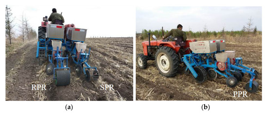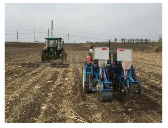 A field test was conducted on the Xiangyang farm of Northeast Agricultural University in Harbin, Heilongjiang, China. The Xiangyang farm is located at Xiangyang Village (45.45° N; 126.53° E; average elevation of 180 m), Xiangfang District, which is in the middle part of the Songneng Plain. The site has a continental climate of the cool temperate zone, which is characterized by strong winds and dry weather in spring, warm and rainy weather in summer and cold and dry weather in winter. The test was conducted on sloping land. The maximum slope angle was smaller than 15°, and the minimum slope angle was larger than 5°. Before this test, stubble cleaning was performed [14] (Figure 5). Ridge planting is a sowing method. Eighteen rows were reserved, and every row was 150 m. In the test, the tractor (John Deere (Ningbo) Agricultural Machinery Co., Ltd., Ningbo, China) and the no-tillage seeder (2BM-2) were used (Figure 5). For the no-tillage seeder, two kinds of press rollers were installed on each side. One side was the BPPD, and the other side was the traditional press roller.