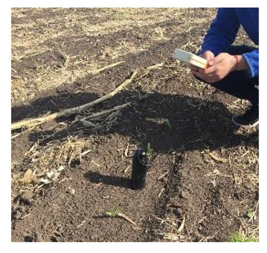 The soil moisture content was measured manually with TZS-1k (the accuracy error of the precision is less than or equal to 2%). The measurement time was from the beginning of the seeding stage (the height of the sprout was approximately 20 mm) to the elongation stage (when the ear differentiated to elongation, the stem near the soil was approximately 20 mm). Measurements were made at 8:00 a.m. on the 14th day after seeding. Each zone was measured separately 3 times randomly. Figure 7 shows how the soil moisture content was measured in the field.