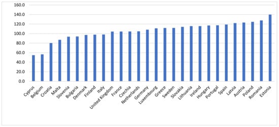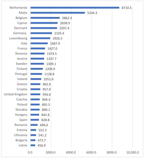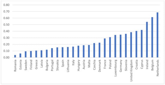 The literature shows a big diversity across the European Union both in terms of employment, costs of labor in agriculture, productivity, and production [,]. In this study, the output intensity level was expressed as the cost of production per 1 ha of utilized agricultural area. Figure 1 presents their average values from 2010 to 2019 in the member states of the EU in an ascending order.